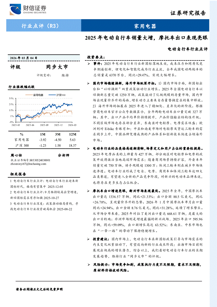 电动自行车行业:财信证券-电动自行车行业点评:2025年电动自行车销量大增,摩托车出口表现亮眼-260304