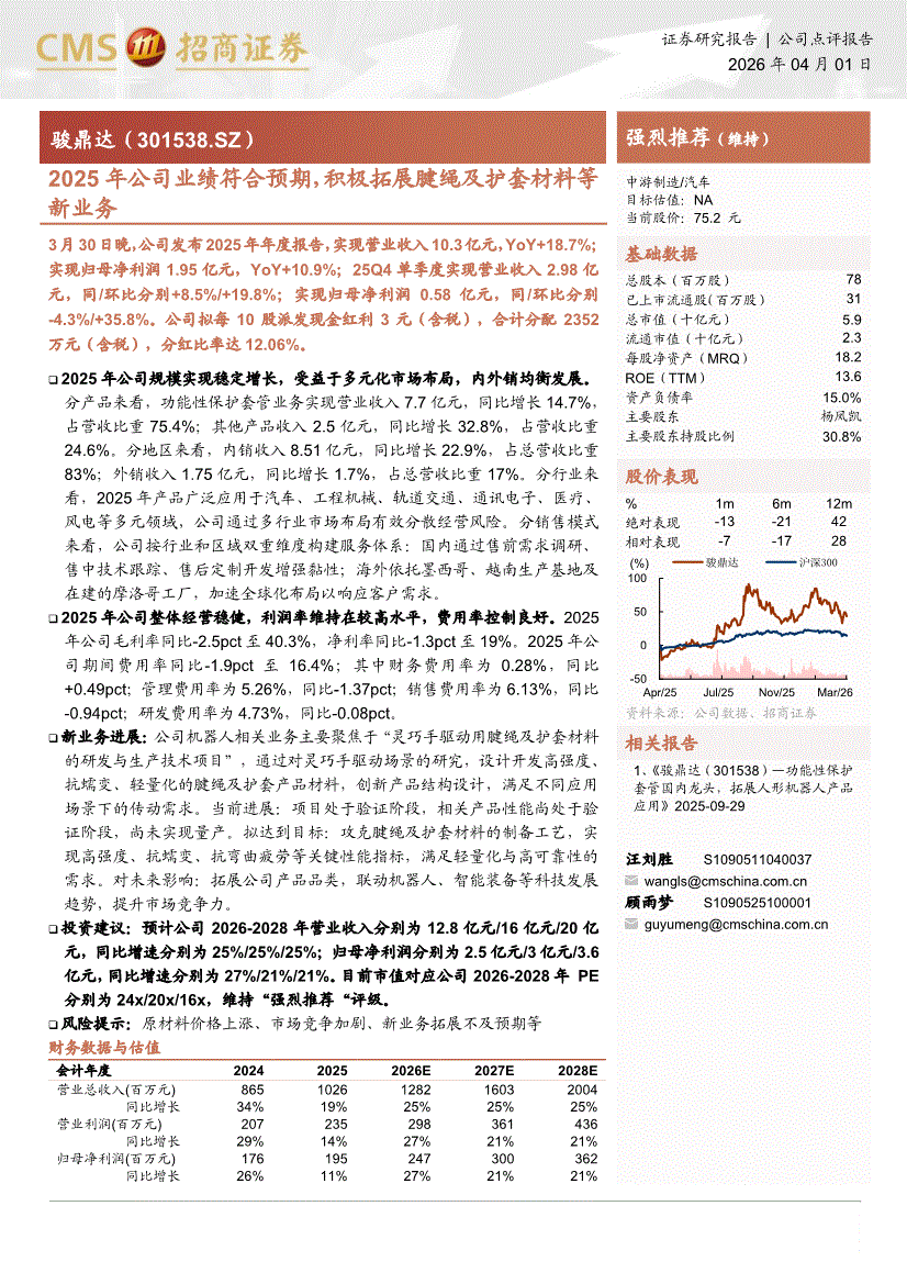骏鼎达:招商证券-骏鼎达-301538-2025年公司业绩符合预期,积极拓展腱绳及护套材料等新业务-260401