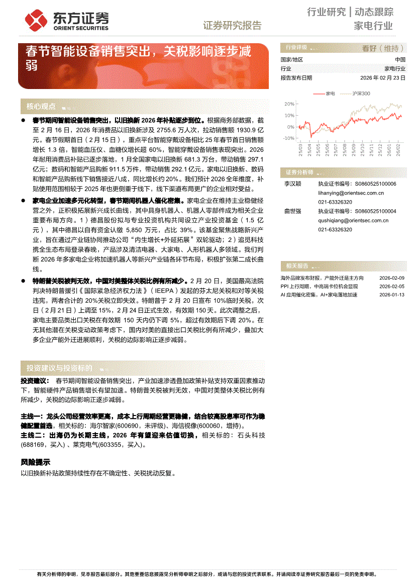 家电行业:东方证券-家电行业动态跟踪:春节智能设备销售突出,关税影响逐步减弱-260223