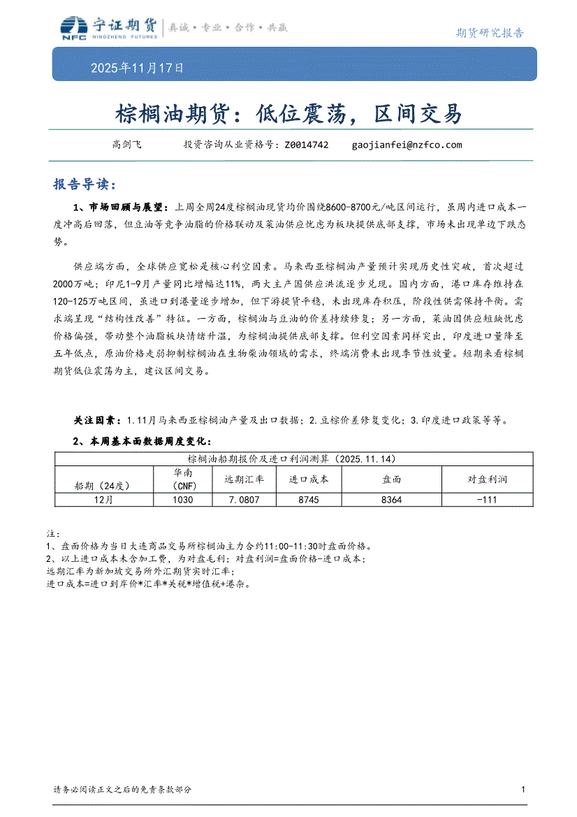 宁证期货-棕榈油期货:低位震荡,区间交易-251117