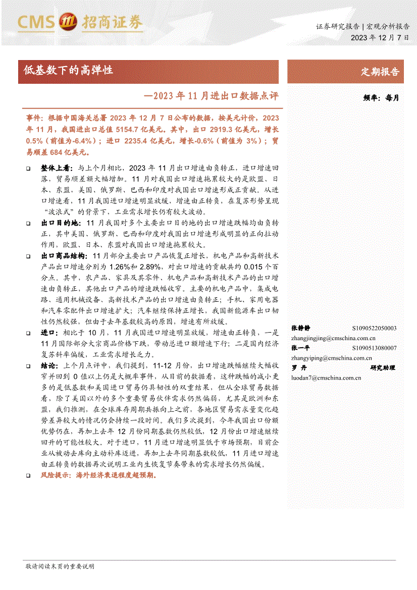 招商证券-2023年11月进出口数据点评:低基数下的高弹性-231207