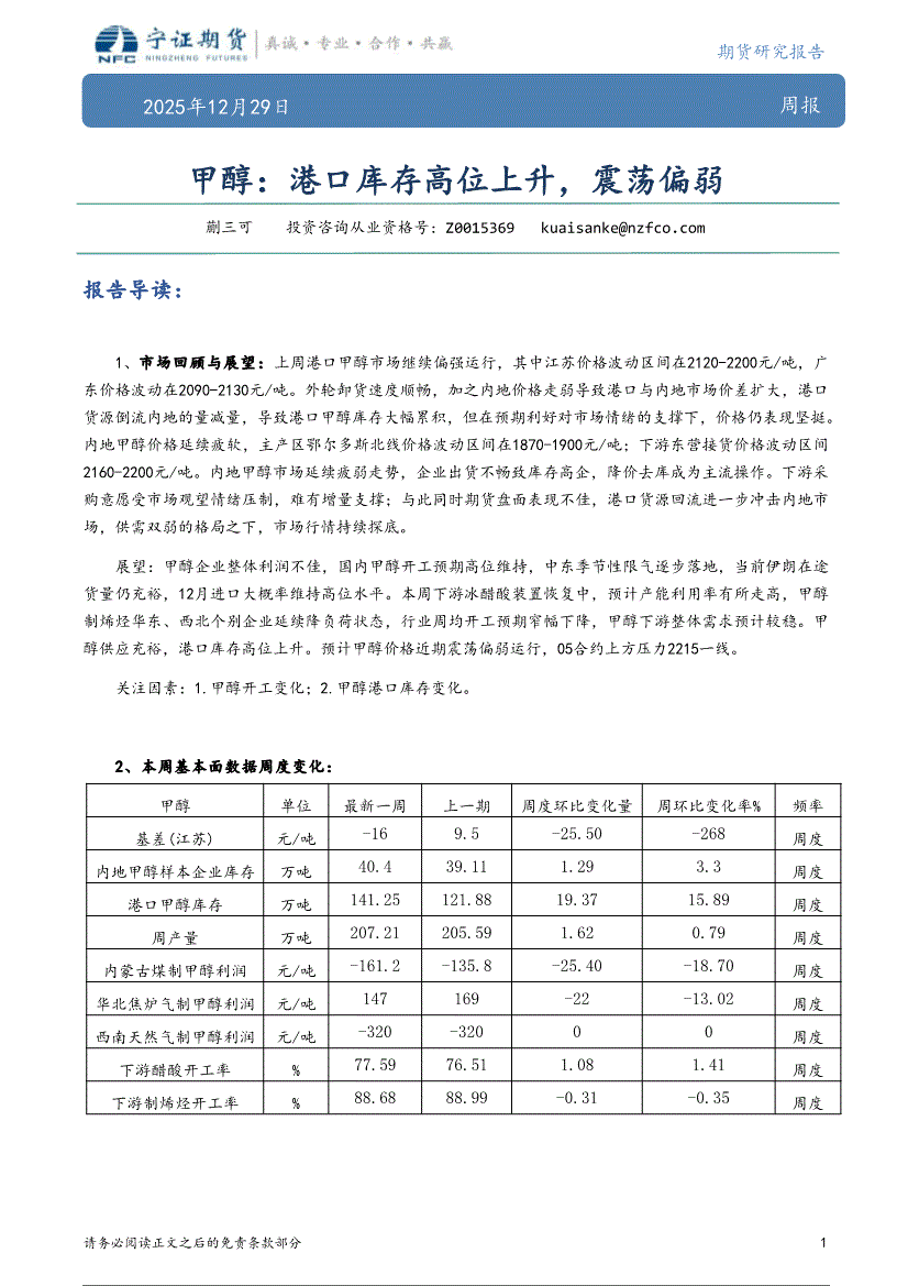 宁证期货-甲醇:港口库存高位上升,震荡偏弱-251229