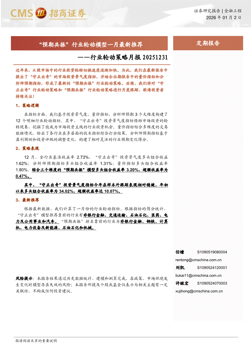 招商证券-行业轮动策略月报:“预期共振”行业轮动模型一月最新推荐-260102