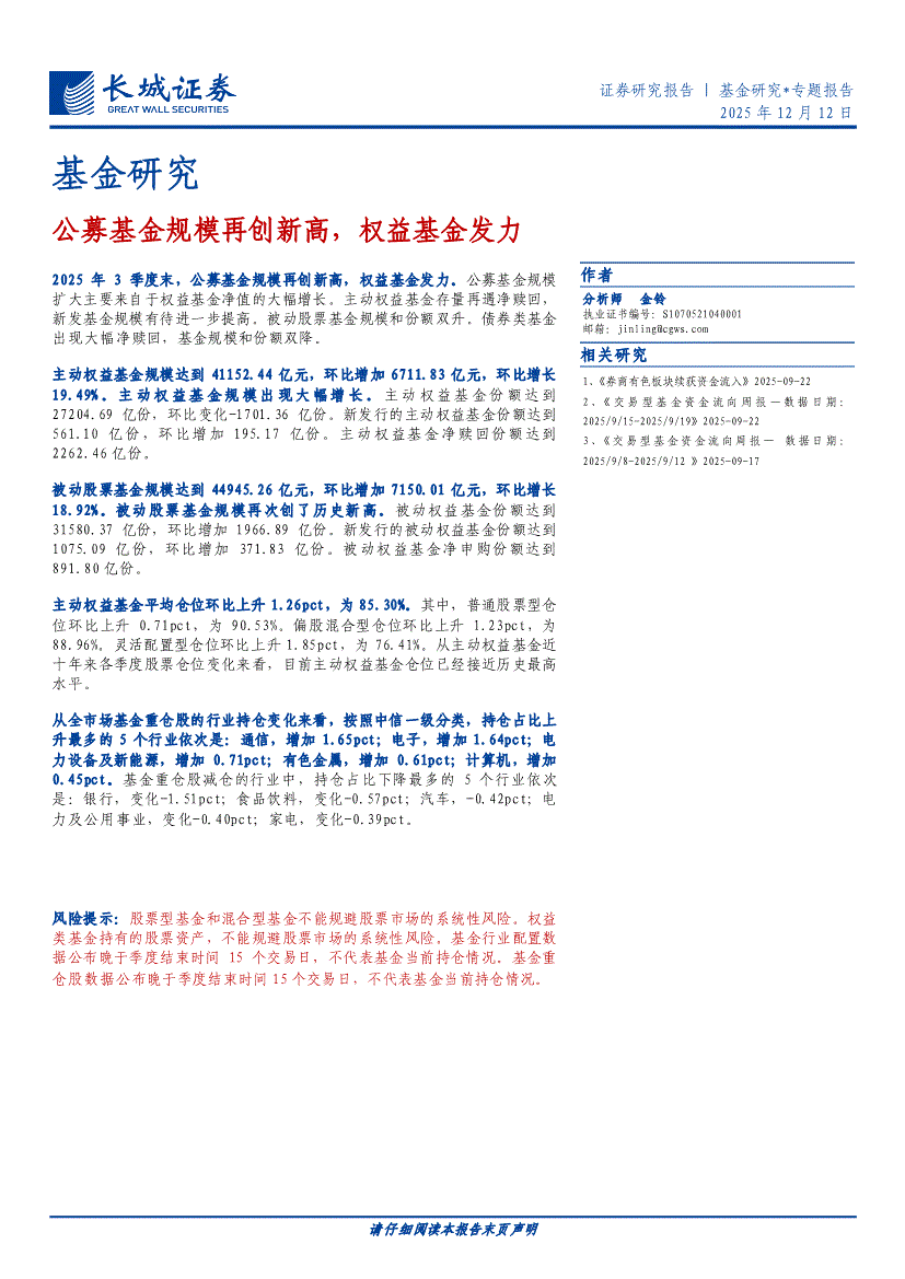 长城证券-基金研究:公募基金规模再创新高,权益基金发力-251212