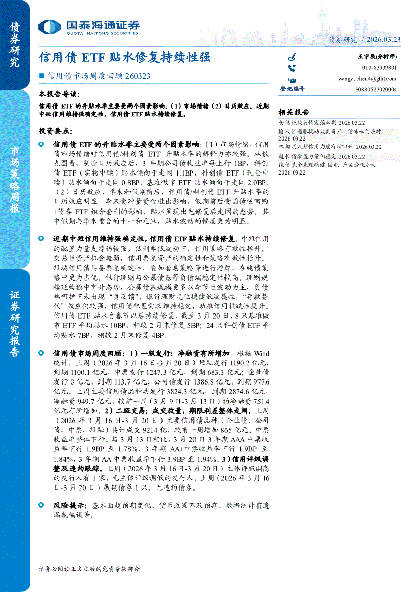 国泰海通证券-信用债市场周度回顾:信用债ETF贴水修复持续性强-260323