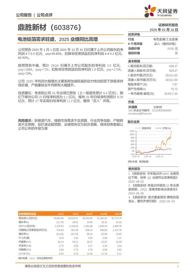 鼎胜新材:天风证券-鼎胜新材-603876-电池铝箔需求旺盛,2025业绩同比高增-260216