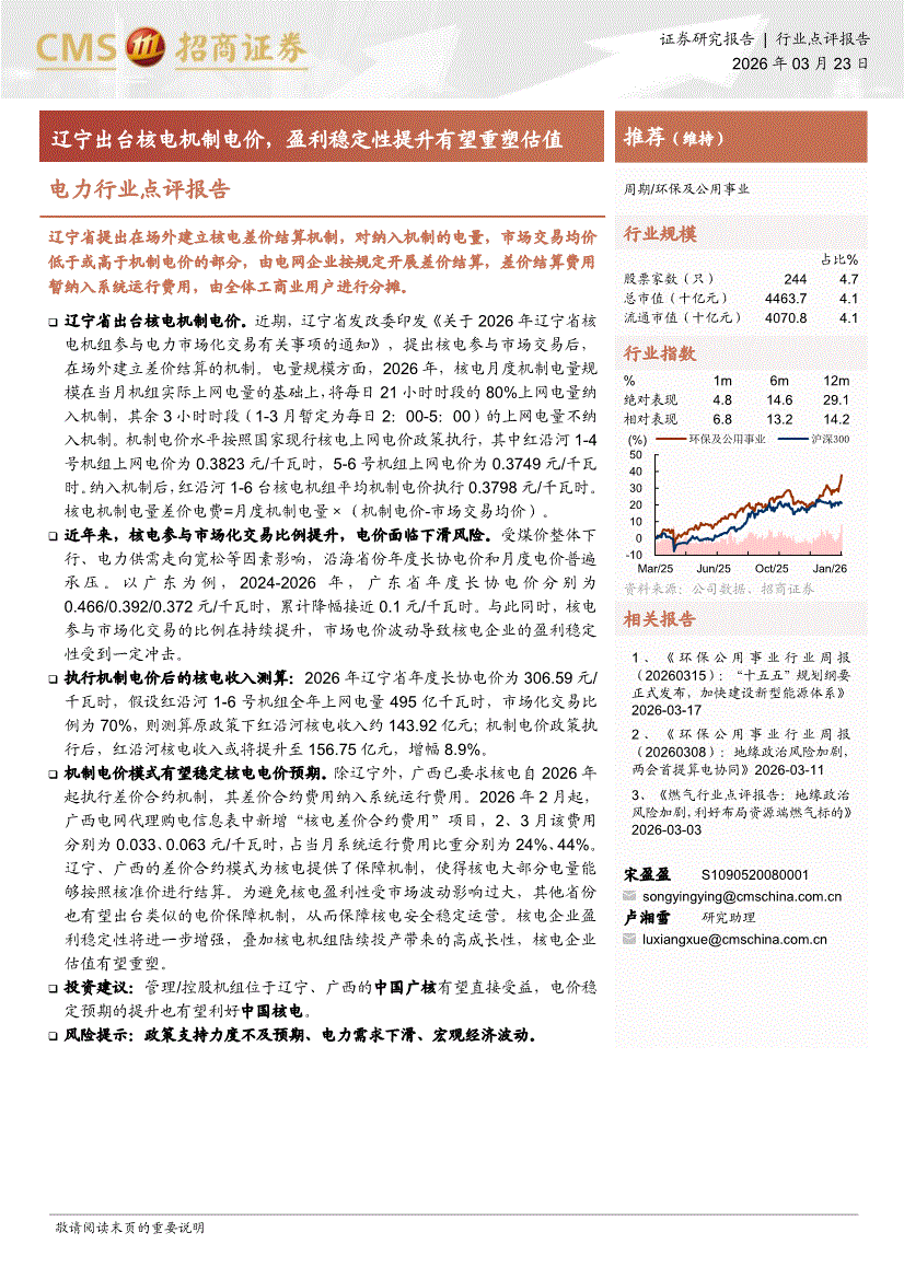 电力行业:招商证券-电力行业点评报告:辽宁出台核电机制电价,盈利稳定性提升有望重塑估值-260323