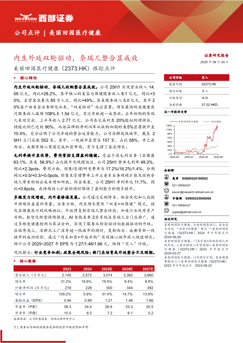 美丽田园医疗健康:西部证券-美丽田园医疗健康-2373.HK-跟踪点评:内生外延双轮驱动,奈瑞儿整合显成效-250924