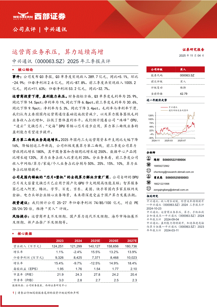 中兴通讯:西部证券-中兴通讯-000063-2025年三季报点评:运营商业务承压,算力延续高增-251104