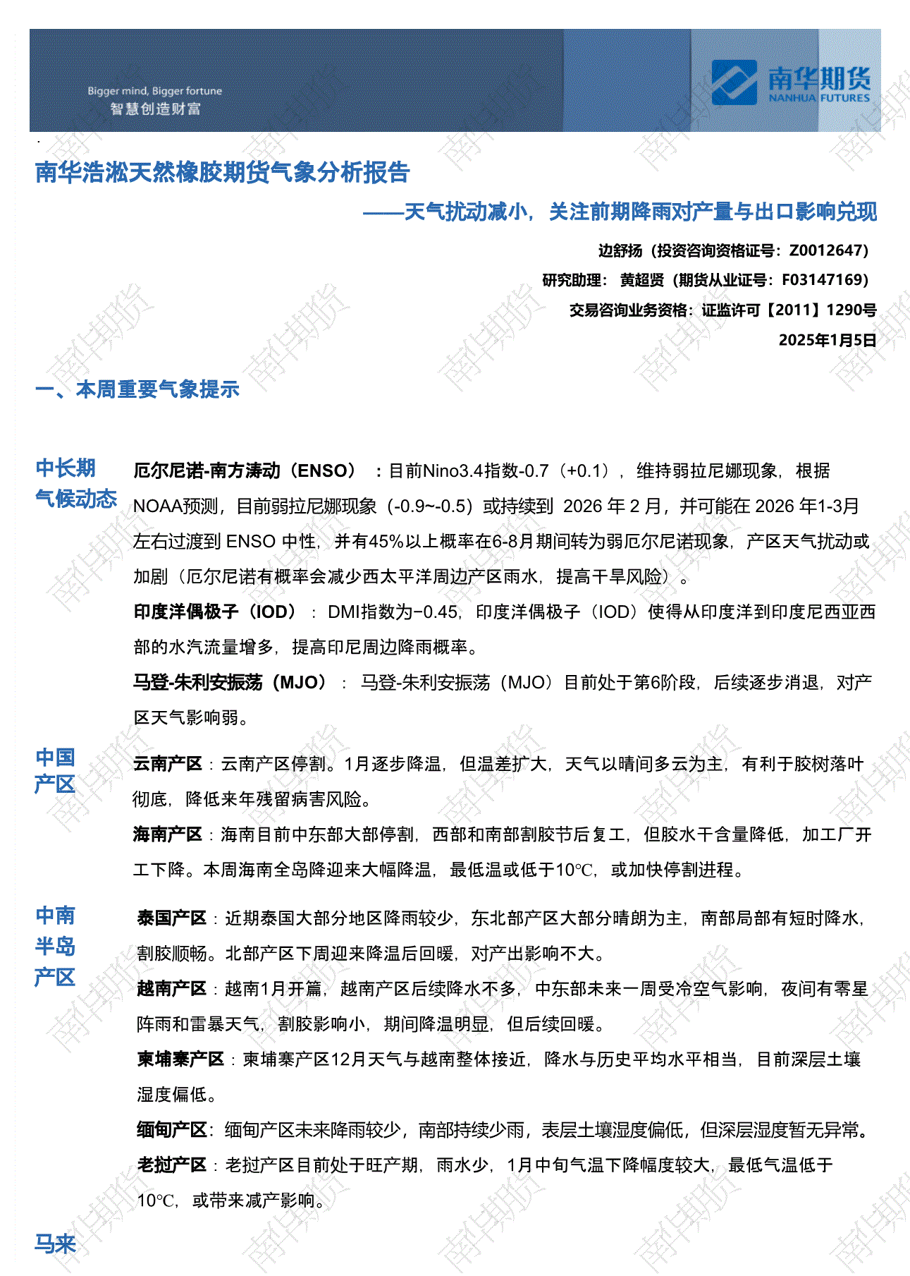 南华期货-浩淞天然橡胶期货气象分析报告:天气扰动减小,关注前期降雨对产量与出口影响兑现-260105