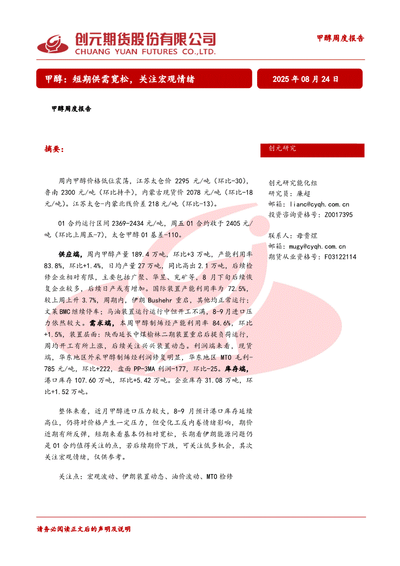 创元期货-甲醇周度报告:短期供需宽松,关注宏观情绪-250824