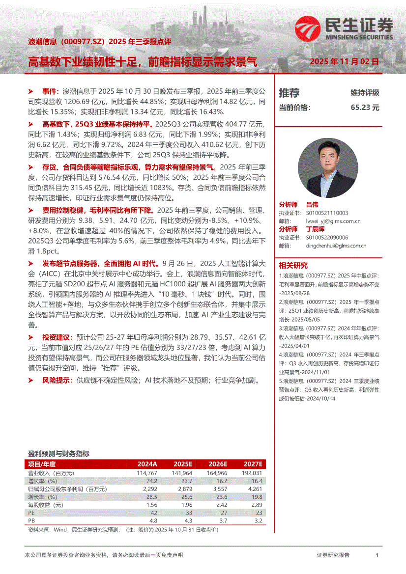 浪潮信息:民生证券-浪潮信息-000977-2025年三季报点评:高基数下业绩韧性十足,前瞻指标显示需求景气-251102