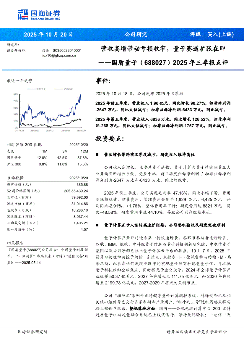 国盾量子:国海证券-国盾量子-688027-2025年三季报点评:营收高增带动亏损收窄,量子赛道扩张在即-251020