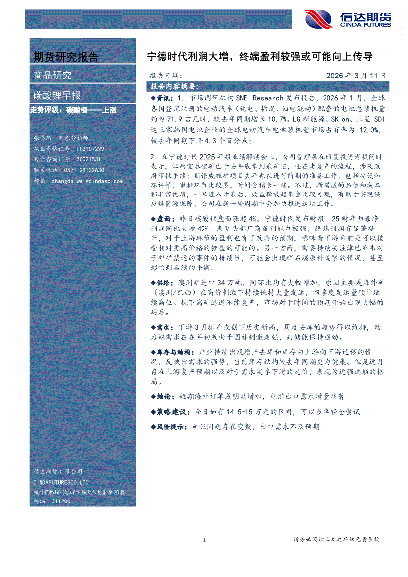 信达期货-碳酸锂早报:宁德时代利润大增,终端盈利较强或可能向上传导-260311