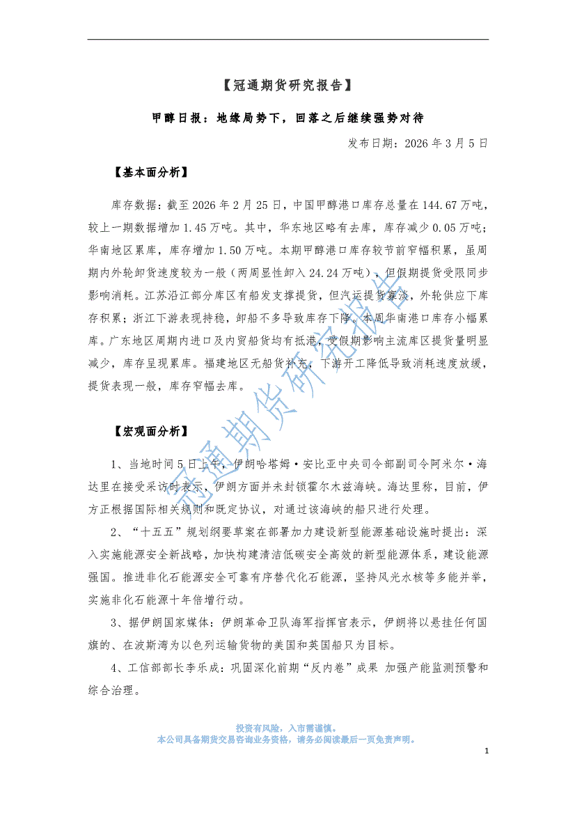冠通期货-甲醇日报:地缘局势下,回落之后继续强势对待-260305