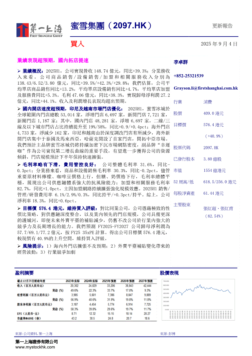 蜜雪集团:第一上海-蜜雪集团-2097.HK-业绩表现超预期,国内拓店提速-250904
