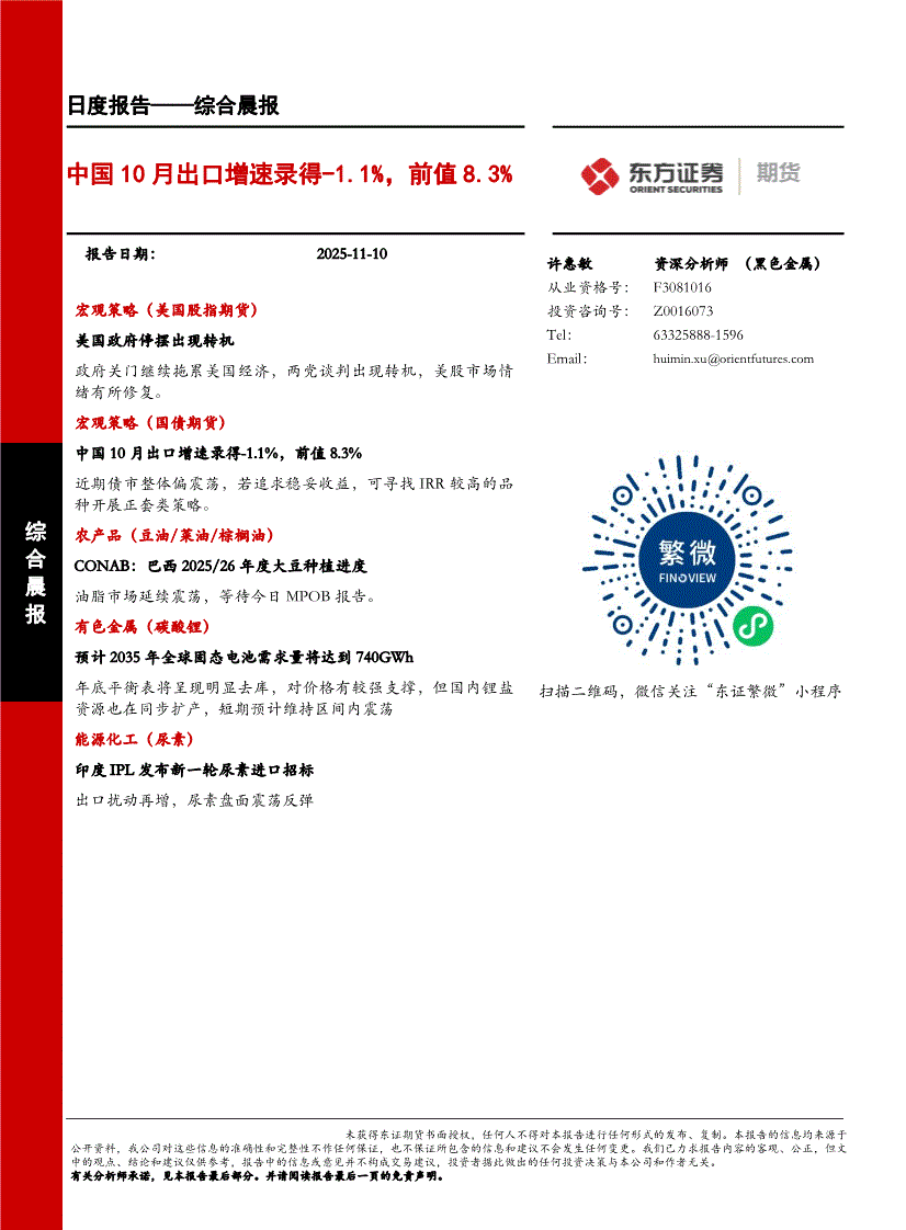 东证期货-综合晨报:中国10月出口增速录得~1.1%,前值8.3%-251110