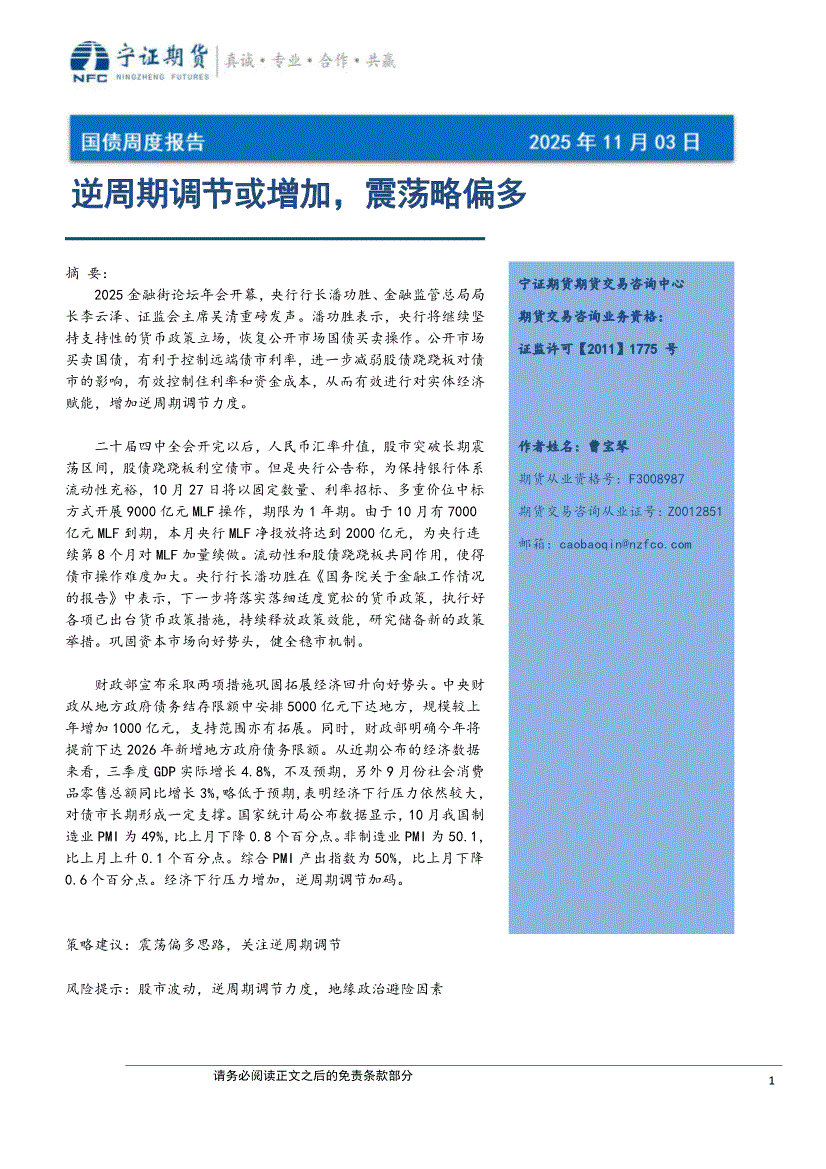 宁证期货-国债周度报告:逆周期调节或增加,震荡略偏多-251103