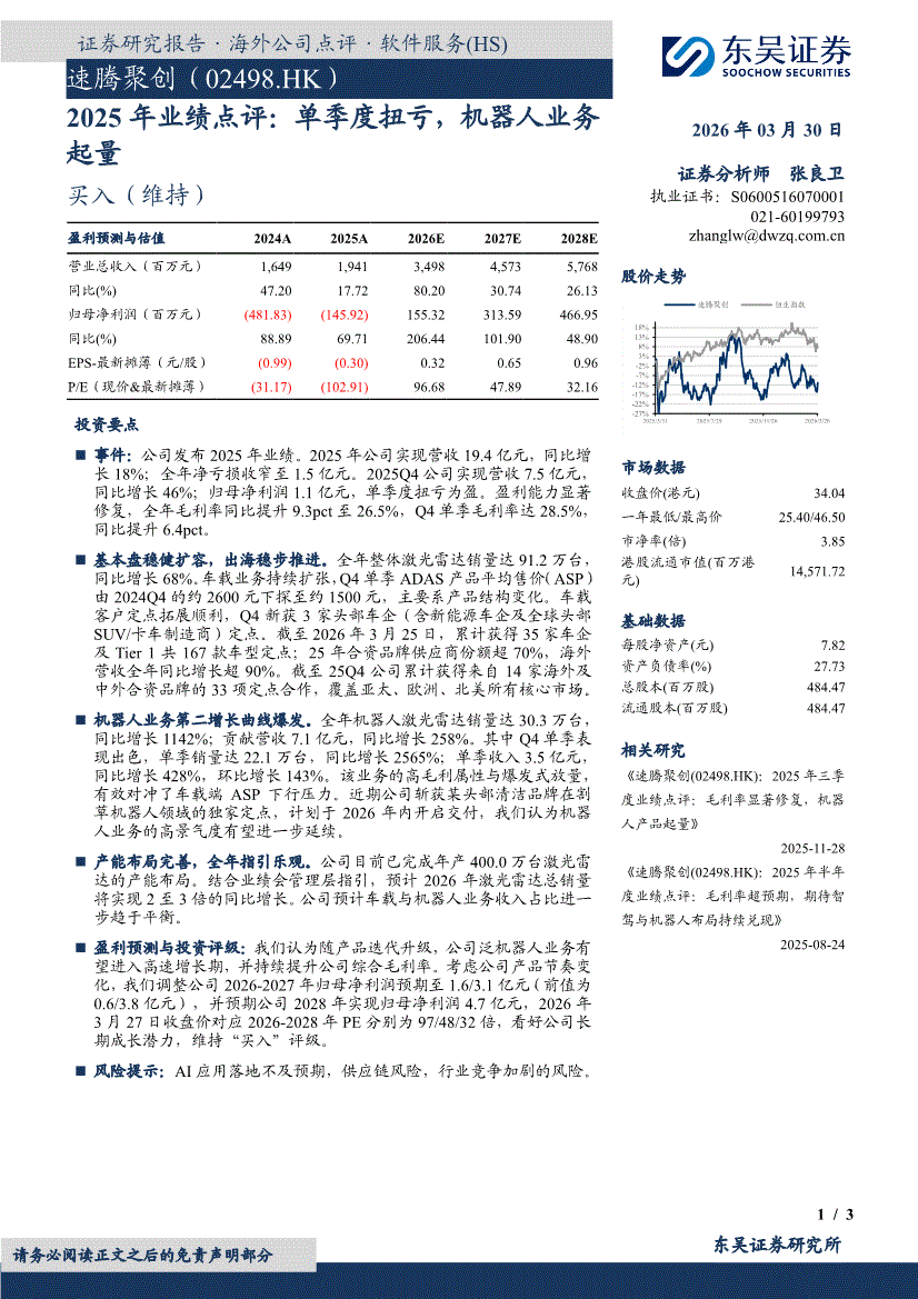 速腾聚创:东吴证券-速腾聚创-2498.HK-2025年业绩点评:单季度扭亏,机器人业务起量-260330