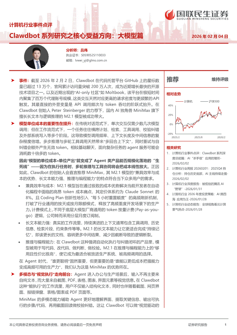 计算机行业:国联民生证券-计算机行业事件点评:Clawdbot系列研究之核心受益方向,大模型篇-260204