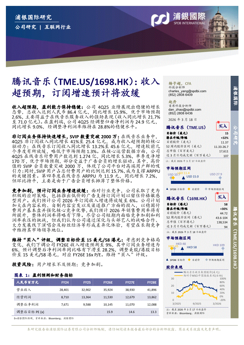 腾讯音乐:浦银国际-腾讯音乐-1698.HK-收入超预期,订阅增速预计将放缓-260318