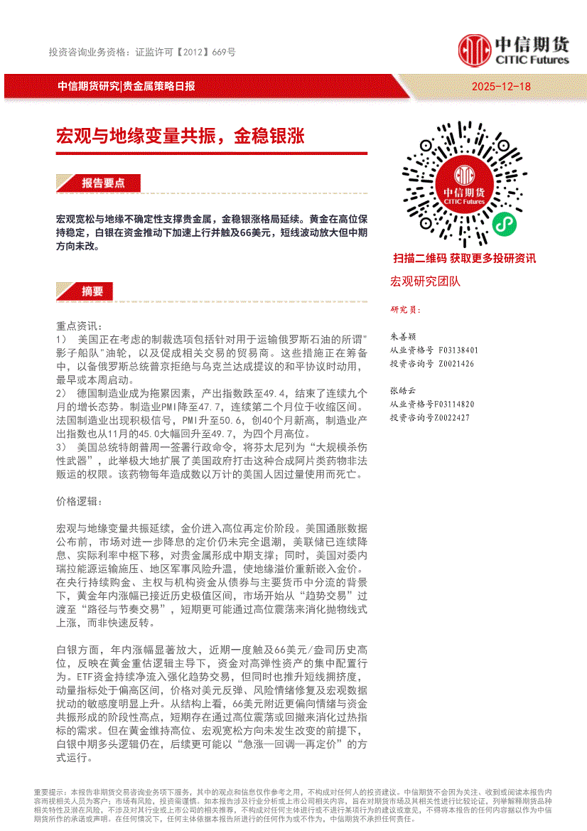 中信期货-贵金属策略日报:宏观与地缘变量共振,金稳银涨-251218