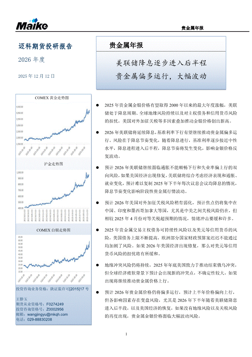 迈科期货-贵金属年报:美联储降息逐步进入后半程,贵金属偏多运行,大幅波动-251212