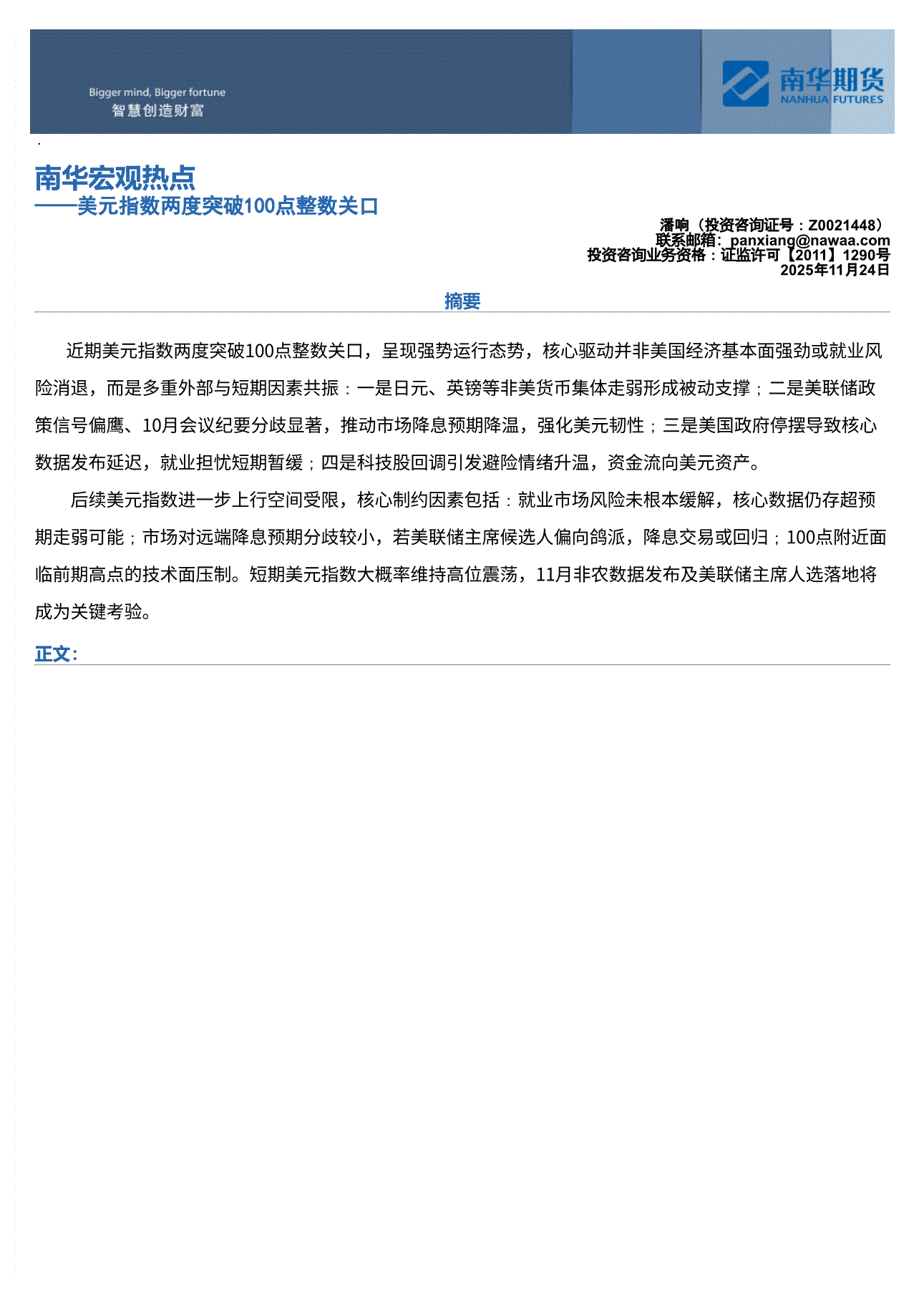 南华期货-宏观热点:美元指数两度突破100点整数关口-251124