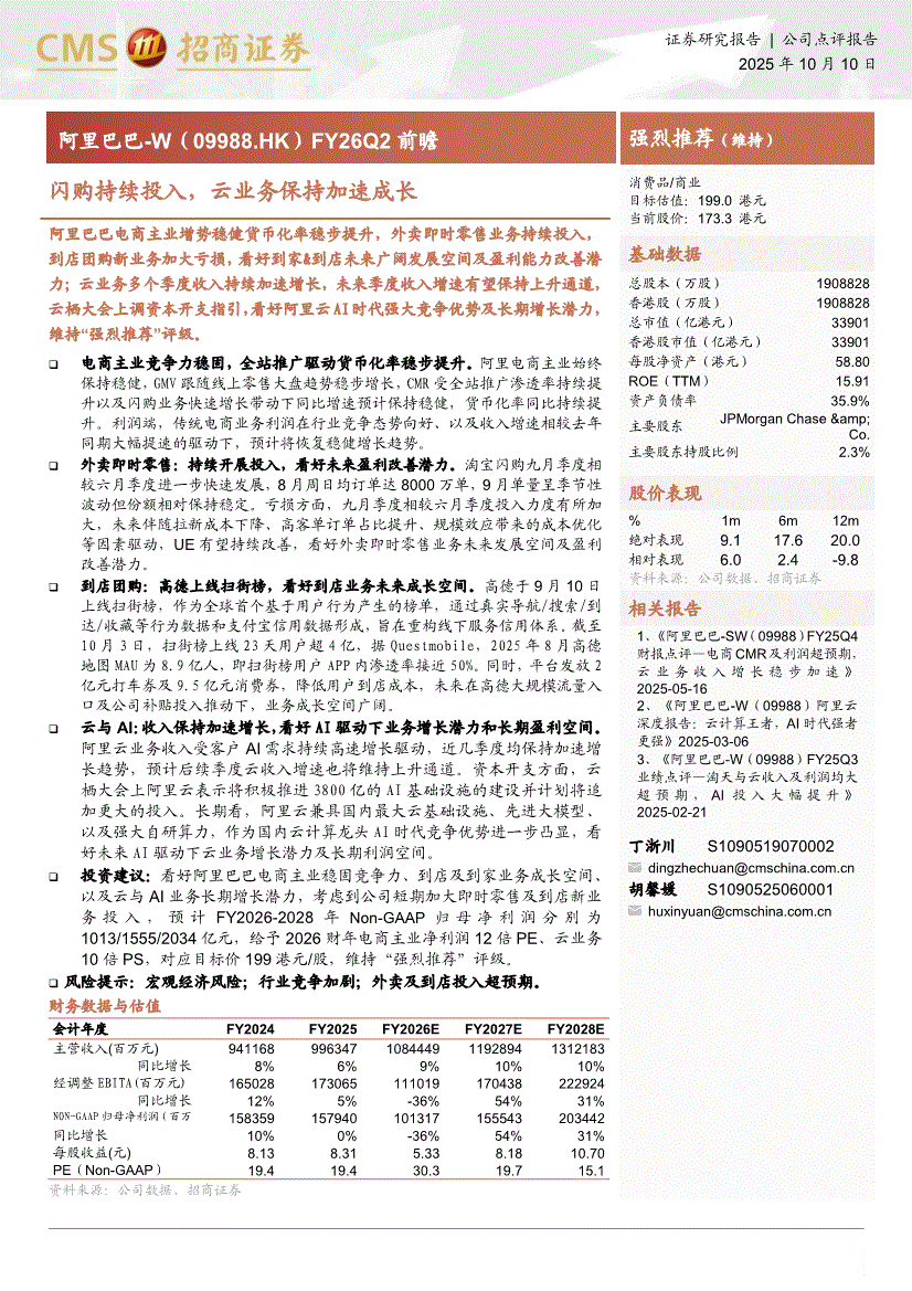 阿里巴巴~W:招商证券-阿里巴巴~W-9988.HK-FY26Q2前瞻:闪购持续投入,云业务保持加速成长-251010