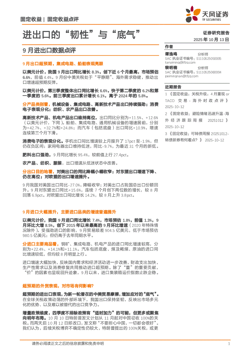天风证券-9月进出口数据点评:进出口的“韧性”与“底气”-251013