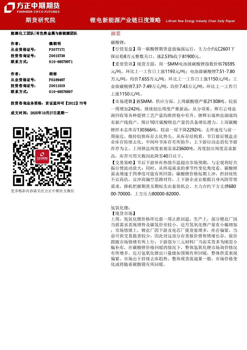 方正中期期货-锂电新能源产业链日度策略-251027