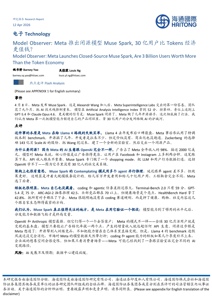 电子行业:海通国际-电子行业:Model Observer,Meta推出闭源模型Muse Spark,30亿用户比Tokens经济更值钱?-260412