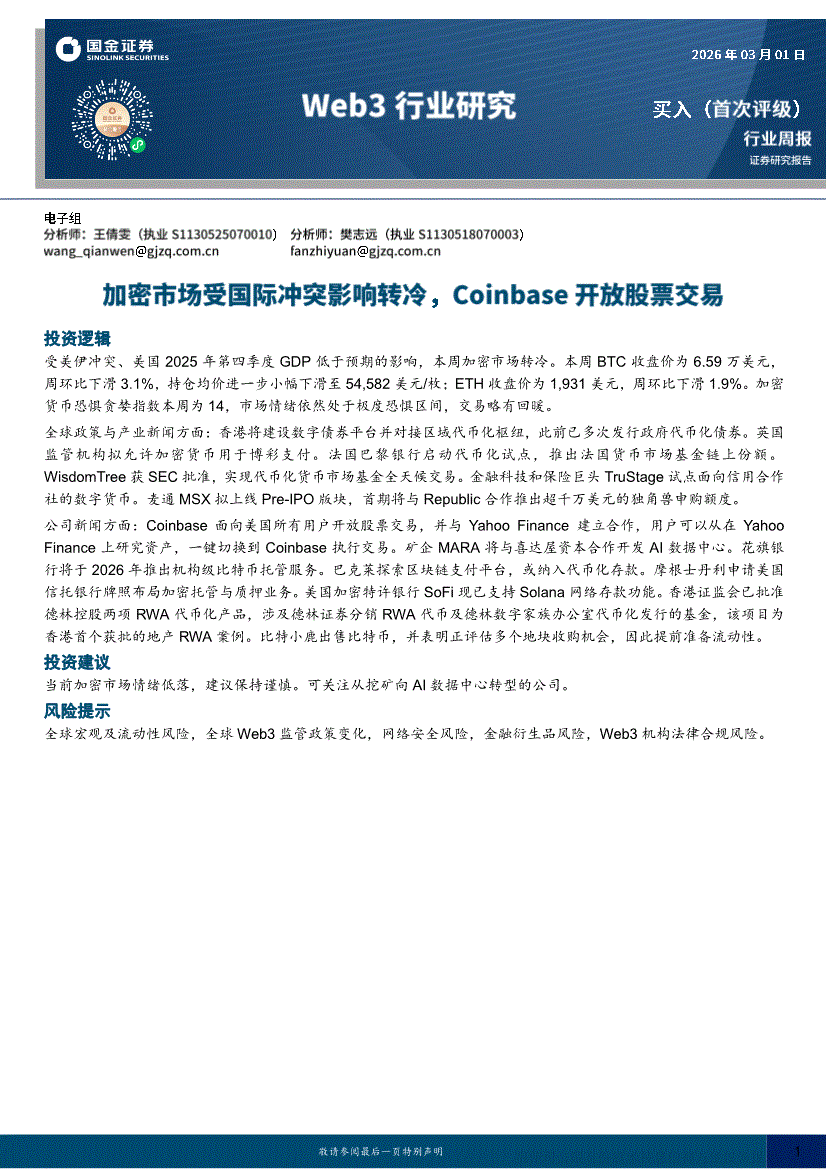 Web3行业:国金证券-Web3行业周报:加密市场受国际冲突影响转冷,Coinbase开放股票交易-260301