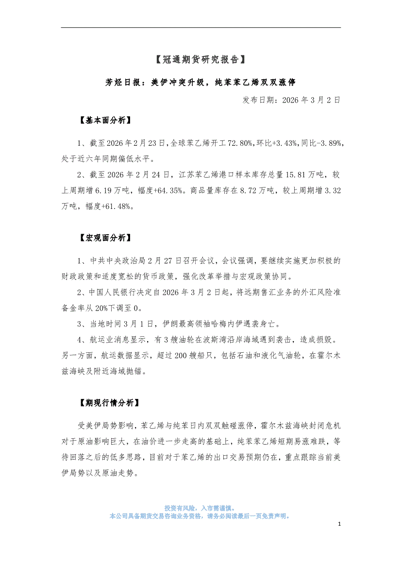 冠通期货-芳烃日报:美伊冲突升级,纯苯苯乙烯双双涨停-260302