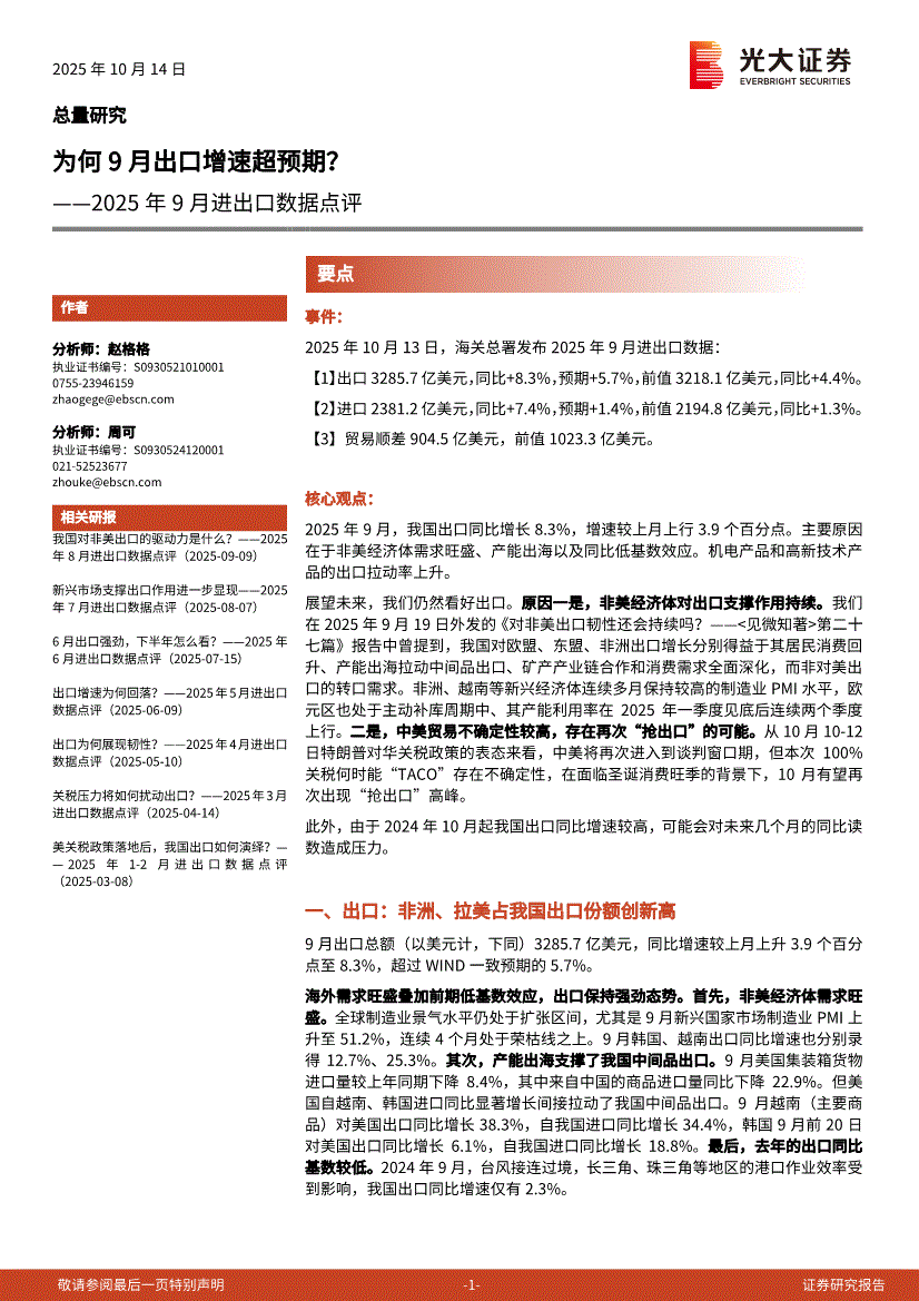 光大证券-2025年9月进出口数据点评:为何9月出口增速超预期? -251014