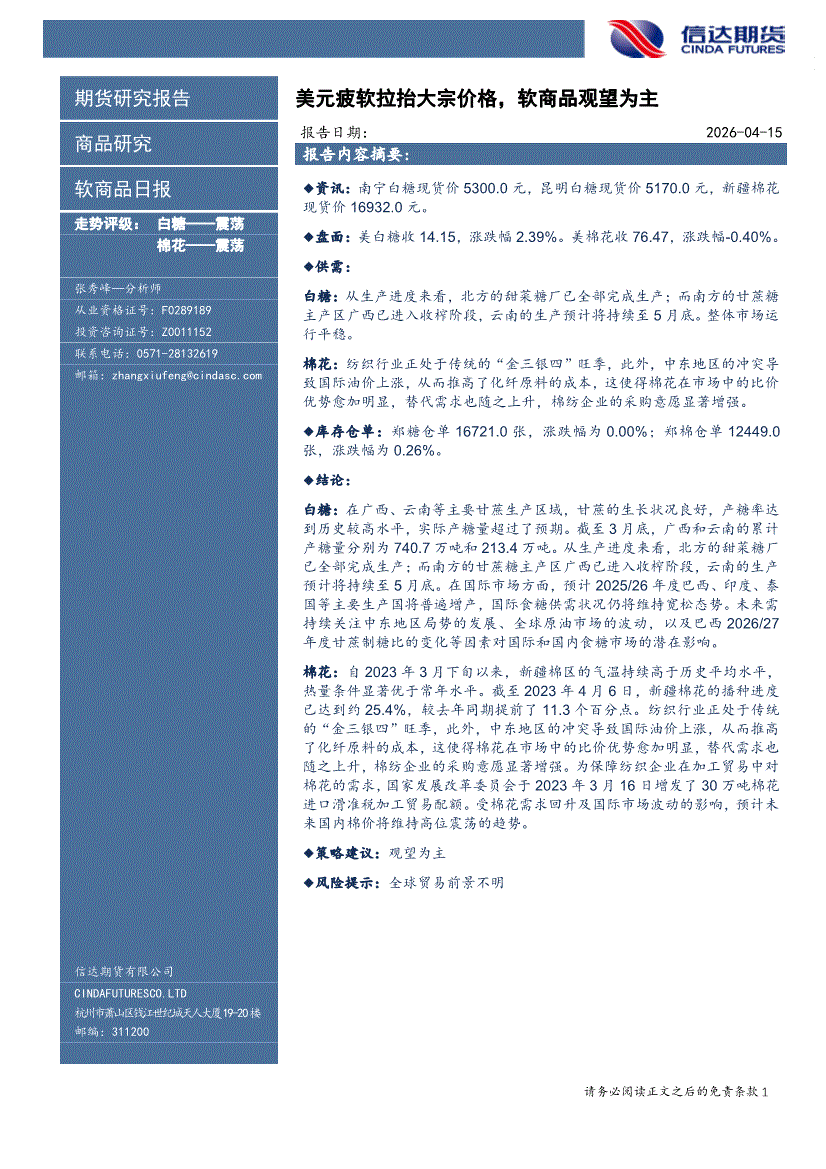 信达期货-软商品日报:美元疲软拉抬大宗价格,软商品观望为主-260415
