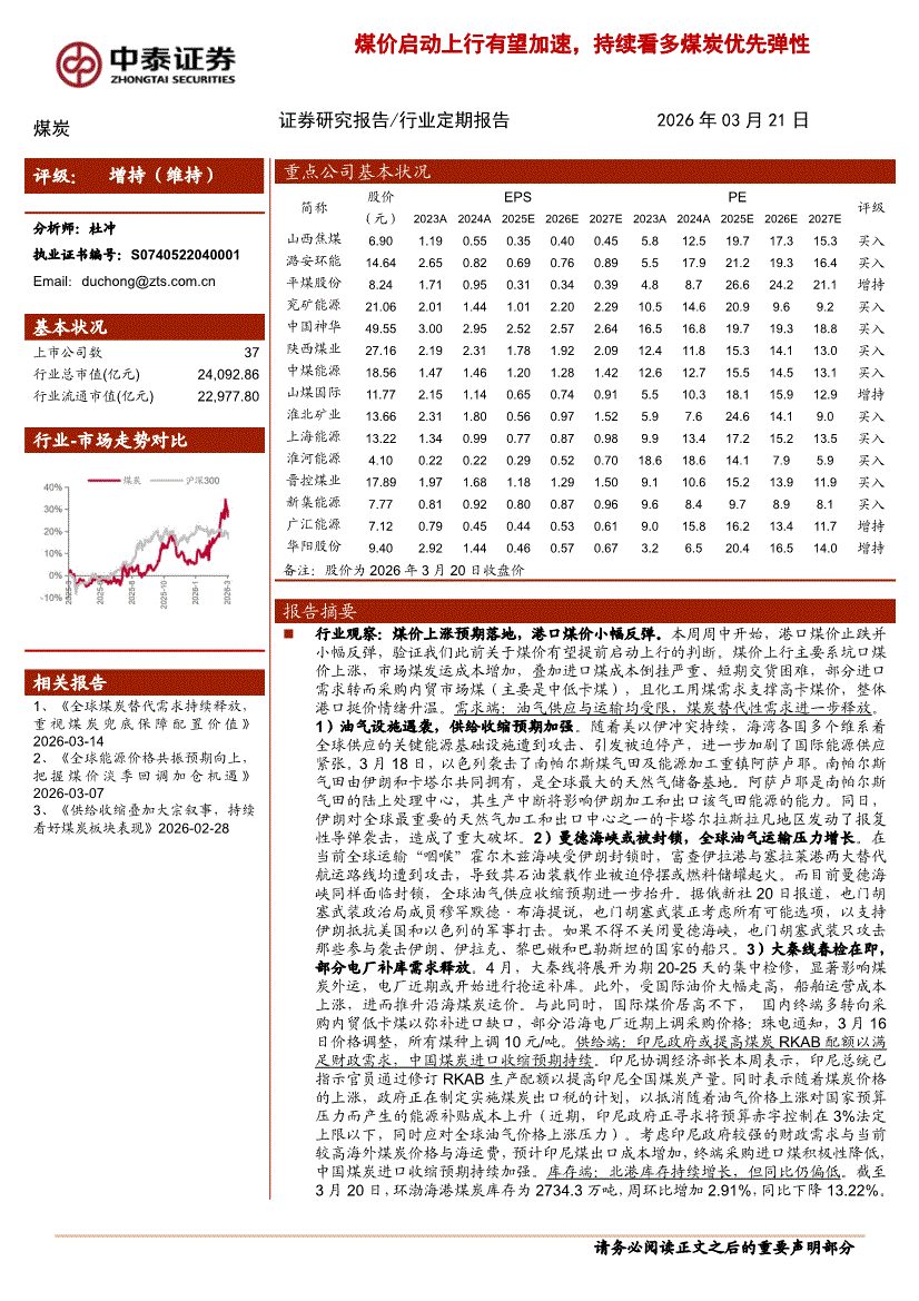 煤炭行业:中泰证券-煤炭行业:煤价启动上行有望加速,持续看多煤炭优先弹性-260321