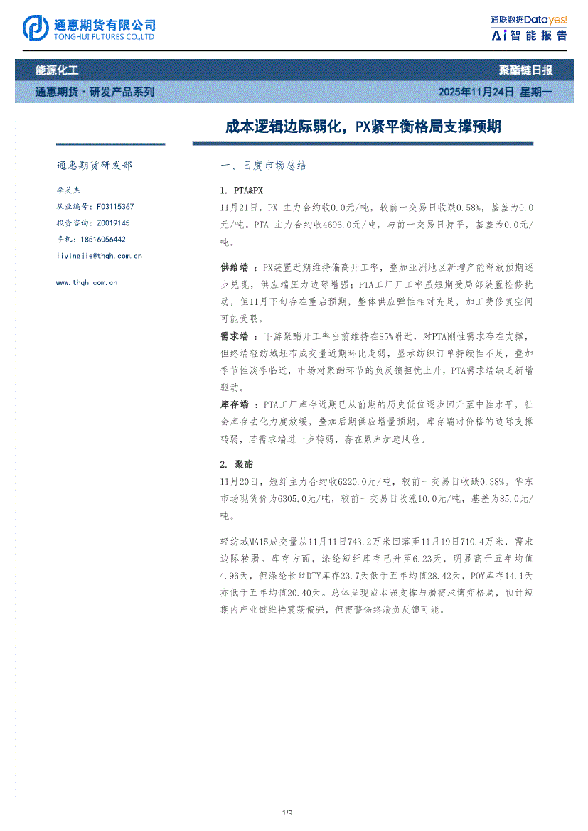 通惠期货-聚酯链日报:成本逻辑边际弱化,PX紧平衡格局支撑预期-251124