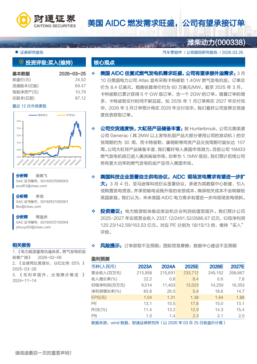 潍柴动力:财通证券-潍柴动力-000338-美国AIDC燃发需求旺盛,公司有望承接订单-260326