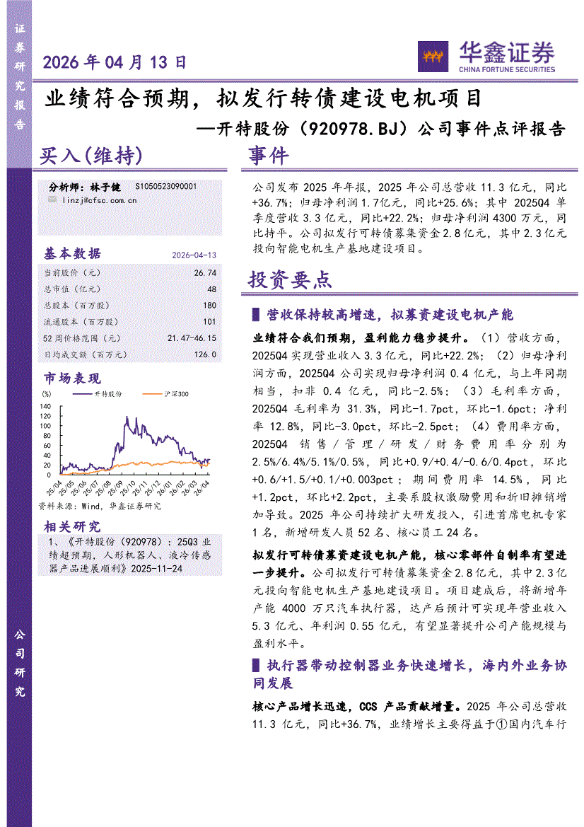 开特股份:华鑫证券-开特股份-920978-公司事件点评报告:业绩符合预期,拟发行转债建设电机项目-260413