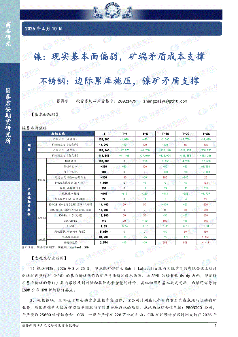 国泰君安期货-镍:印尼镍矿计价改变,政策影响成本预期,不锈钢,现实偏弱压制,关注镍矿政策影响-260415