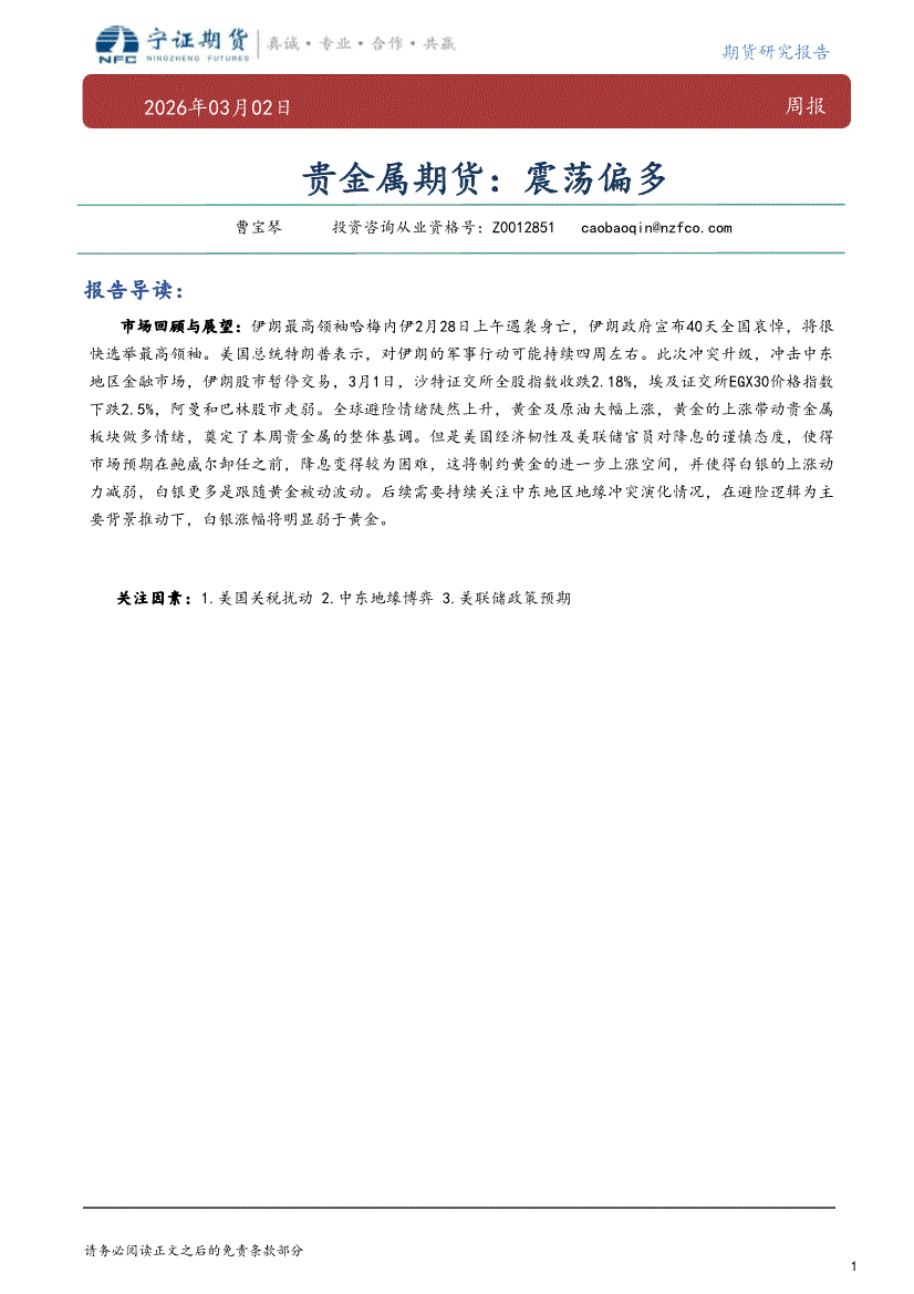 宁证期货-贵金属期货周报:震荡偏多-260302