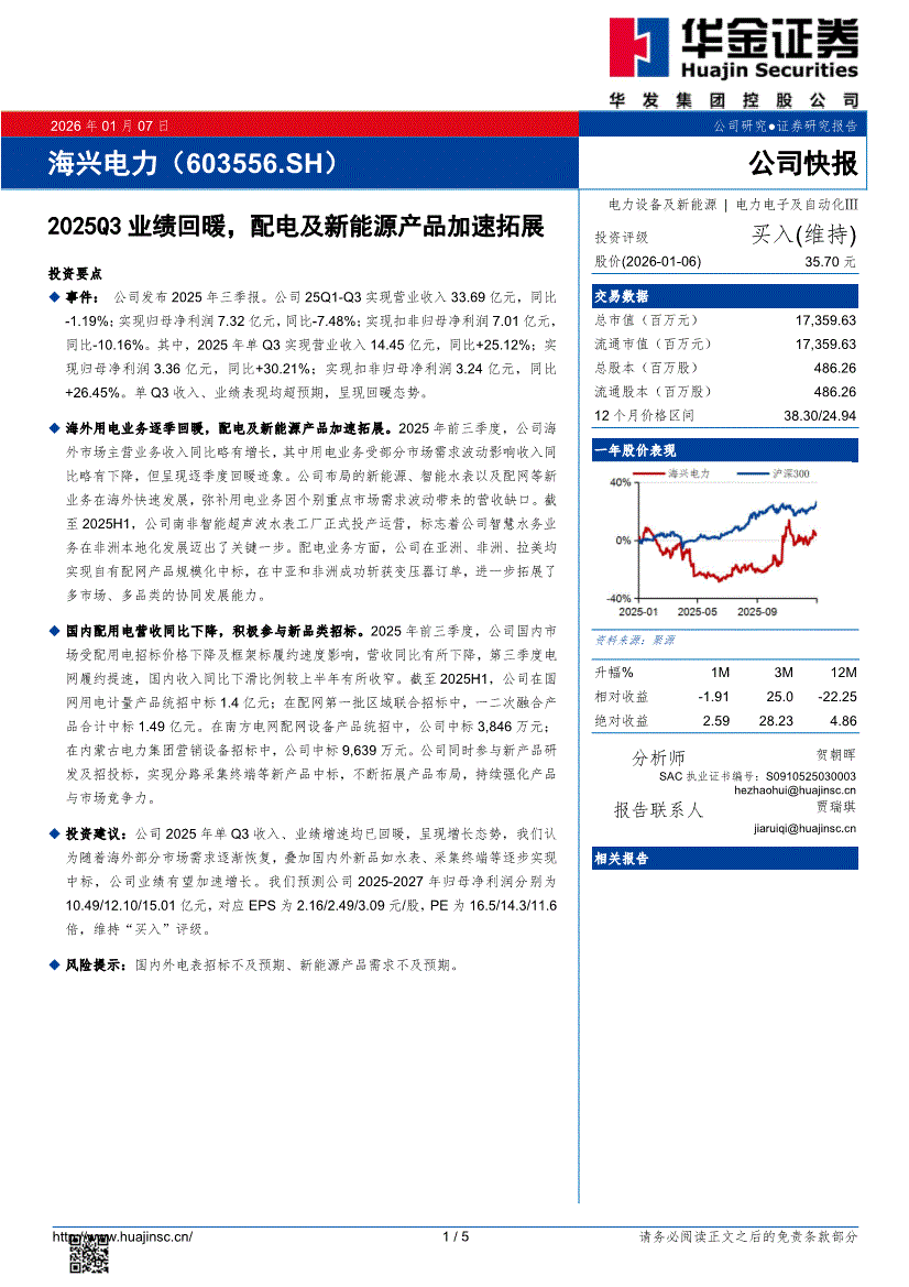 海兴电力:华金证券-海兴电力-603556-2025Q3业绩回暖,配电及新能源产品加速拓展-260107