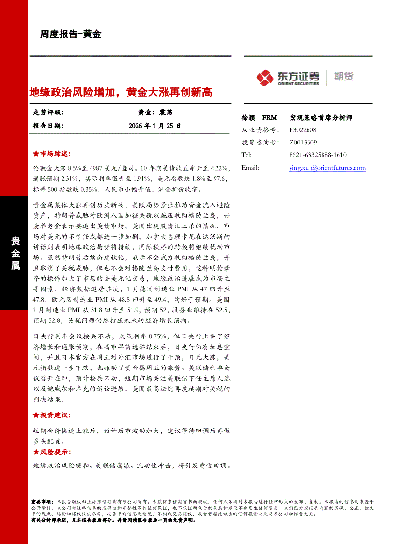 东证期货-黄金周度报告:地缘政治风险增加,黄金大涨再创新高-260125