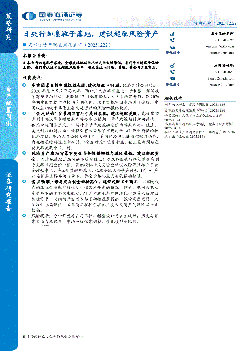 国泰海通证券-战术性资产配置周度点评:日央行加息靴子落地,建议超配风险资产-251222
