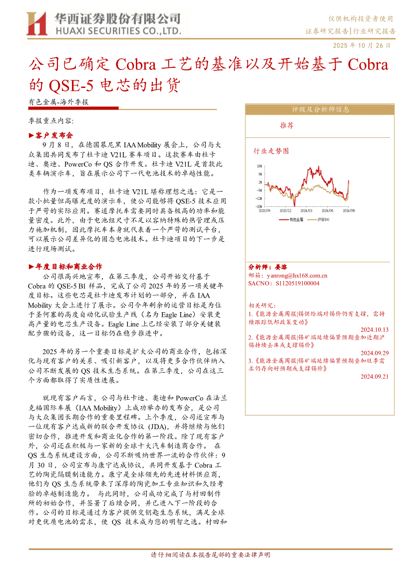 有色金属行业:华西证券-有色金属行业~海外季报:公司已确定Cobra工艺的基准以及开始基于Cobra的QSE~5电芯的出货-251026