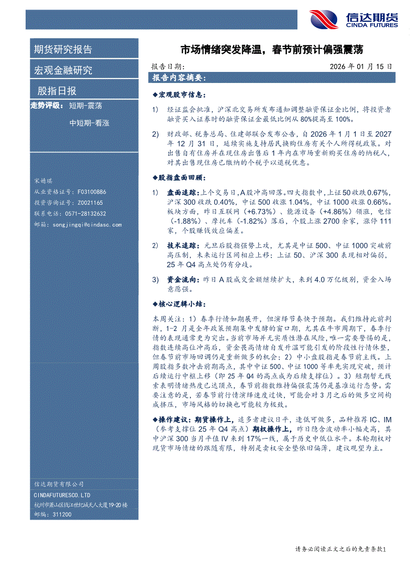 信达期货-股指日报:情绪突发降温,春节前预计偏强震荡-260115