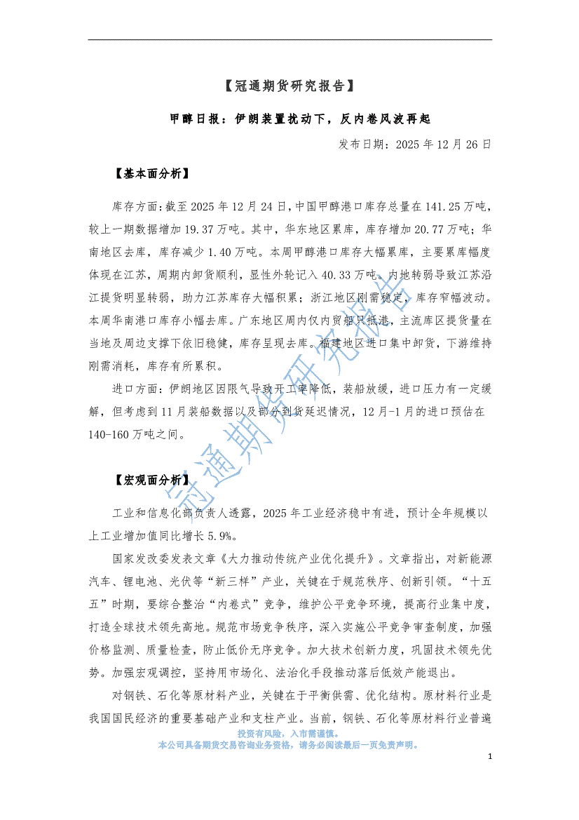 冠通期货-甲醇日报:伊朗装置扰动下,反内卷风波再起-251226