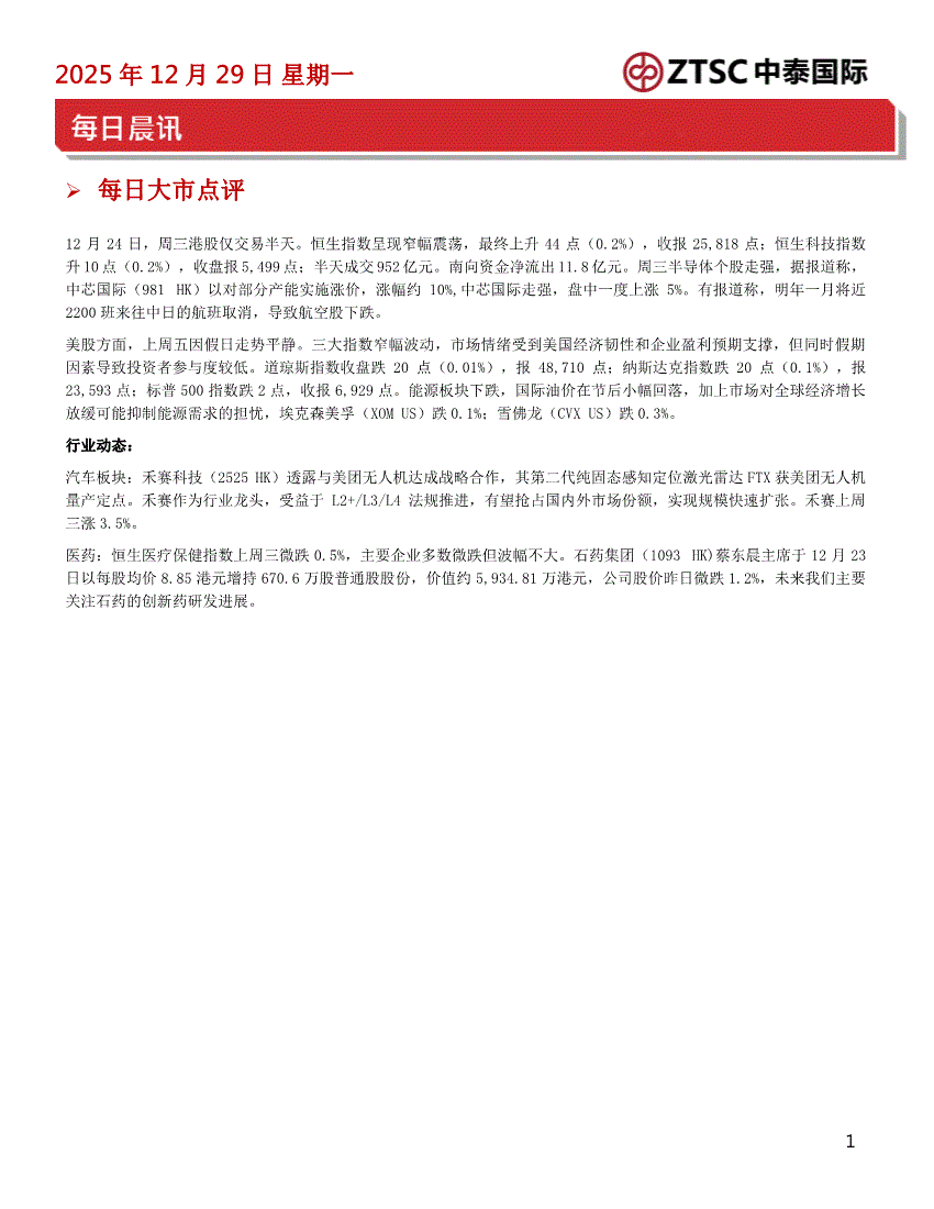 中泰国际-每日晨讯-251229