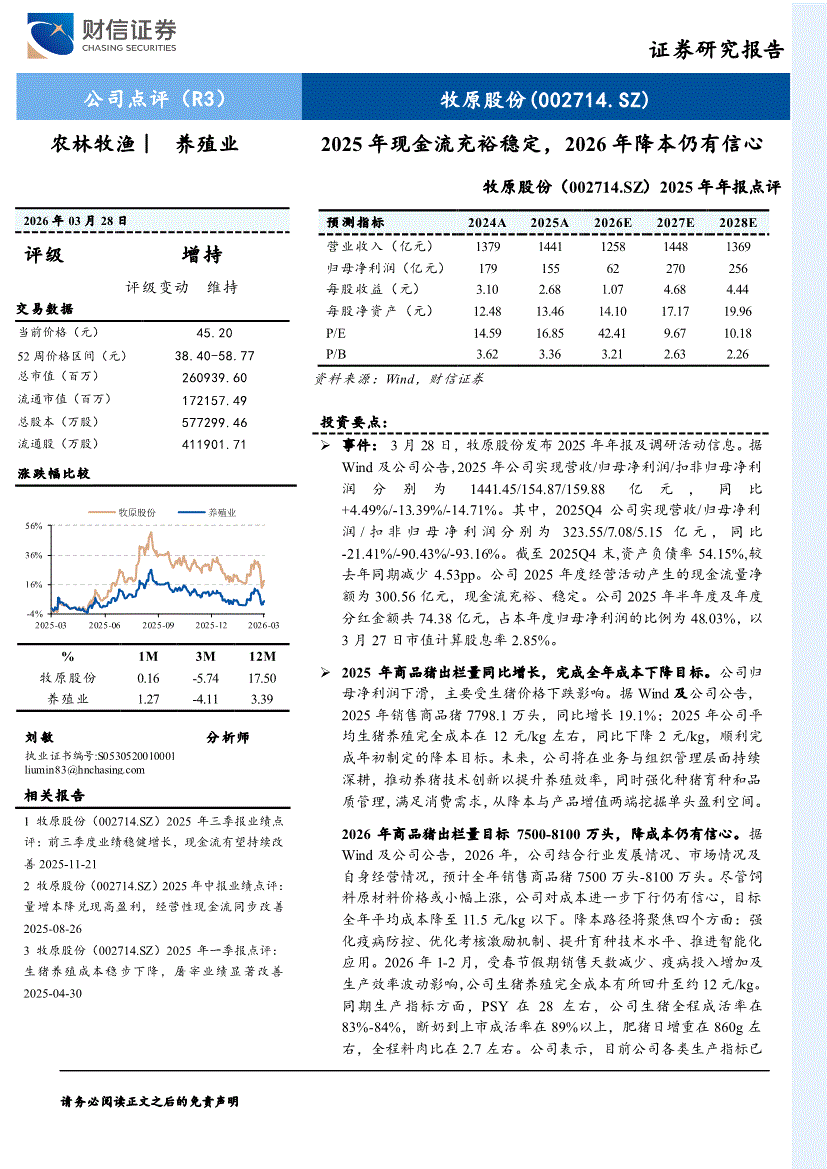 牧原股份:财信证券-牧原股份-002714-2025年年报点评:2025年现金流充裕稳定,2026年降本仍有信心-260328